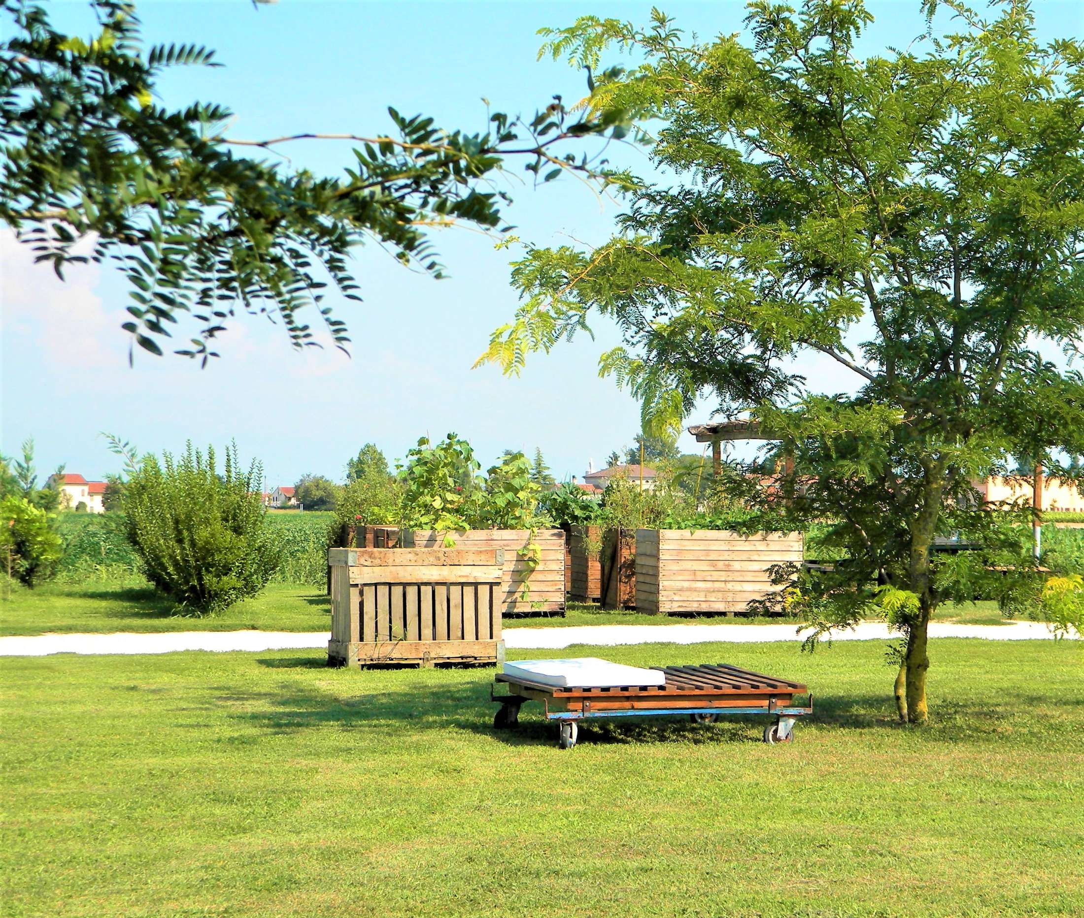 Wait, stand here, where I am standing now: what do you see near the open door? There, now there is a large courtyard, a deck chair in the shade to relax on, and the organic vegetable garden.