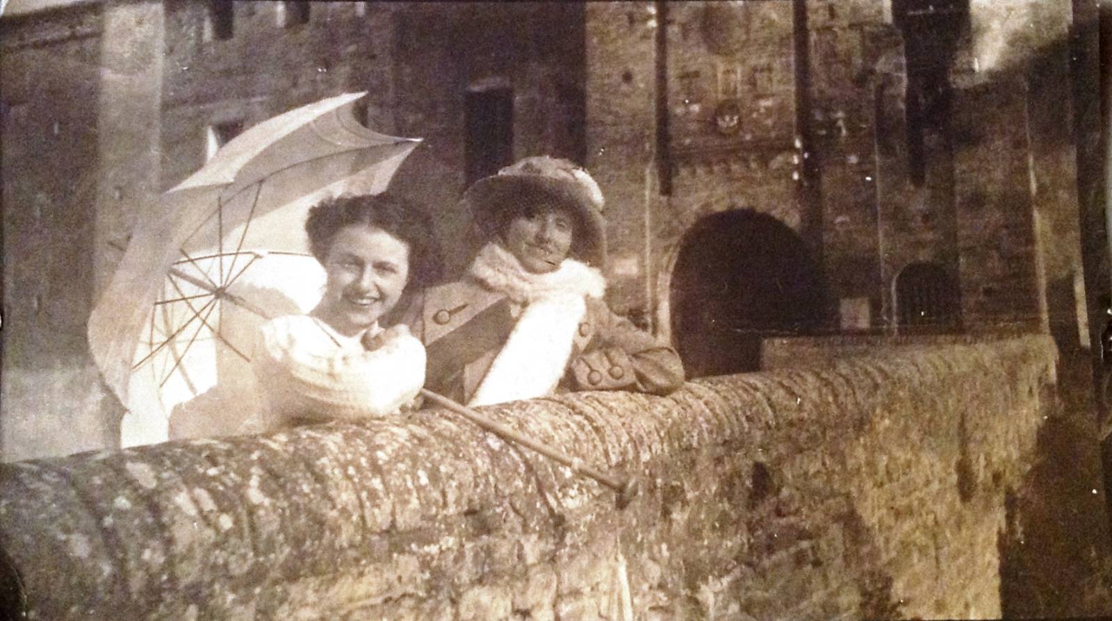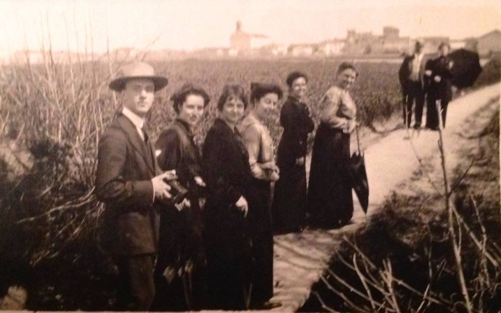 If you are romantic like I am, take a look at these two beautiful photographs: the first shows Enrico’s grandparents taking a walk in the country when they were young, right on the Via Tavanara that goes towards Sanguinetto (where we are). In the background you can see the castle of Sanguinetto and the church. The second picture shows Enrico’s grandmother – she’s the one with the umbrella – together with her cousin, and in the background, you can just make out the castle.